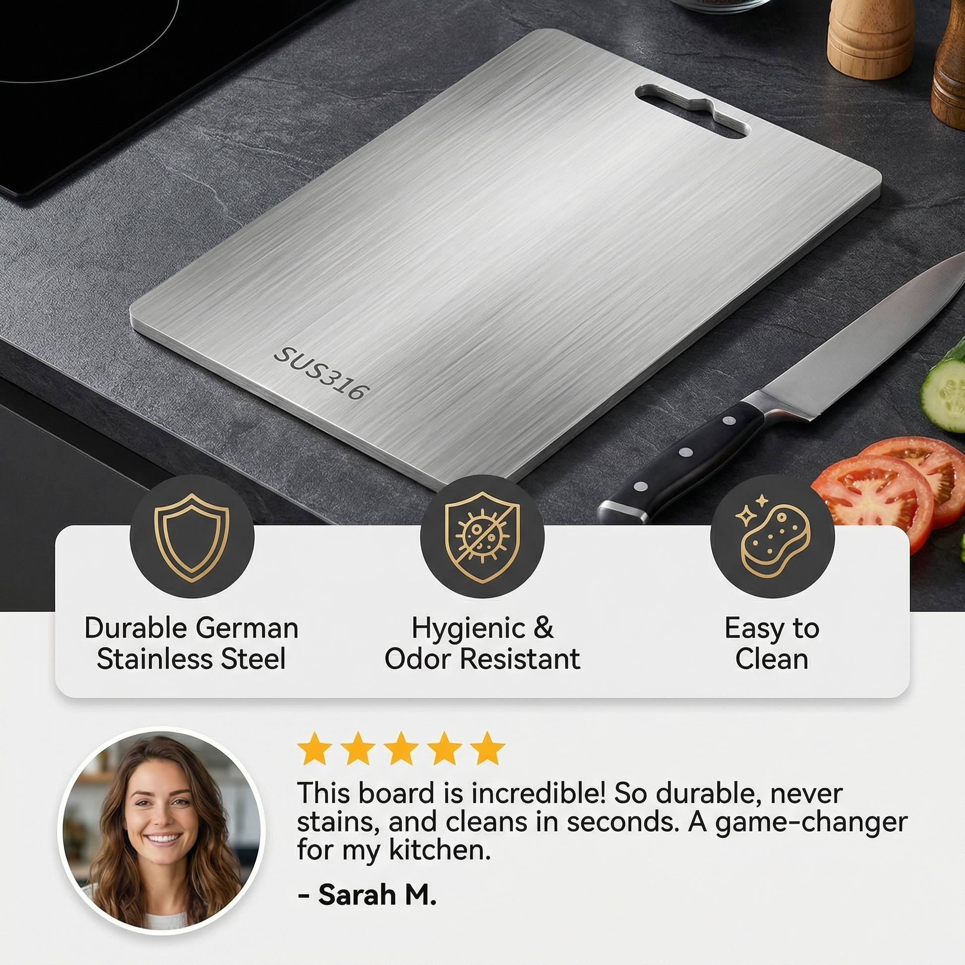 🦠 Antibacterial protection: Cross-contamination is a thing of the past. The non-porous titanium surface blocks bacteria and creates a cleaner, safer kitchen environment.